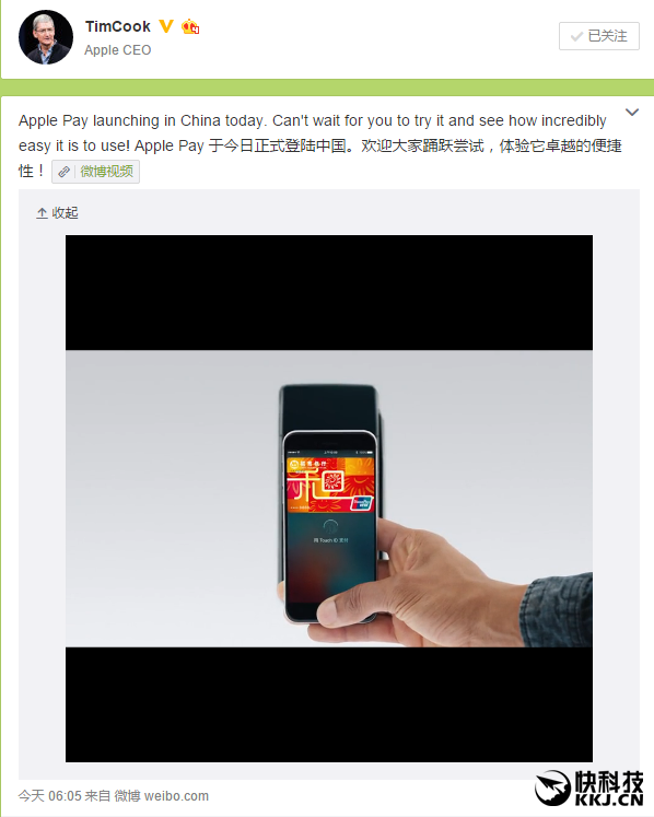 值得一提的是,今天早上苹果CEO库克亲自在微博上对Apple Pay做起了推广,并附上了一段Apple Pay演示视频。