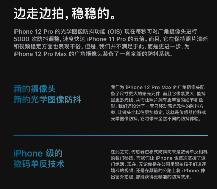 |HomePod mini 苹果在2017年推出了智能音箱 HomePod,但一直到今天估计都没卖出去多少个,库克寻思了一下:可能是卖太贵了,那我们推出一个廉价版吧! HomePod mini 同样自带 Siri 语音助手,它体积更小,高度只有不到9厘米,但是依然保持了高质量的音质,有白色和深空灰两种外观。 既然是新品,当然得有点新东西。HomePod mini 具有 Apple S5 芯片,软硬件协作有佳,Siri 还能识别出不同的说话者,一家人都可以对它发出不同的指令,还能控制智能家居。 如果你家里有多个 HomePod mini,它们会互相配合,同步在线发声。如果你家的面积大到说话都很难让每个人听到,HomePod mini 就可以充当你的传话筒了。(苹果实在是高估了我家的面积,我流出了不争气的泪水) 好了好了,重点是价格。如果你买不起2799的 HomePod ,那么你一定要试试 HomePod mini。 HomePod mini 售价为 749元 。 中国大陆发售时间待定。 |iPhone 12 & 12 mini ok,知道你更想看的是新 iPhone ,他来了。 首先,iPhone 12 全系支持 5G 网络,全系 A14 仿生芯片加持,全系超视网膜 XDR 屏幕,全系 MagSafe 磁吸式充电生态系统(这是啥,后面再讲)。 5G 不用多说,安卓用户们都用一年多了,iPhone 终于迎头赶上,然后超越。在硬件上,苹果为 iPhone 12 系列重新定制了高灵敏度、高功效的天线和无线元器件。 并且尽可能多的支持所有 5G 频段,不用担心出国会断网。 iPhone 12 各款机型还拥有智能数据模式,可智能地判断何时需要 5G 速度,并实时平衡数据用量、速度和耗电量,帮助延长电池续航。(Tips:iPhone 12 mini 是单卡) A14 也不用多介绍了吧,半个月前 iPad Air 4 首发,现在依然超越目前安卓阵营所有手机芯片。苹果现场演示了《英雄联盟》手游: XDR 超视网膜屏,就是去年 Pro 系列才有的那个,iPhone 12 和 iPhone 12 mini 也有了,而且进一步升级到了更加坚固的屏幕材质:超瓷晶面板。玻璃更耐用,并将抗跌落能力提升至四倍。 另外,iPhone 12 比 11 薄了11%、轻了16%、小了15%。 iPhone 12 和 iPhone 12 mini 具有IP68 级防泼溅,可抵御咖啡、汽水等常见液体的泼溅。(温馨提示:不防手贱) 虽然外观看起来还是一样的双摄,但其实是升级了的。 f/1.6的大光圈镜头配合 A14 仿生芯片,捕捉光源增加了 27%,原深感摄像头、广角和超广角摄像头均支持夜间模式以及更快的深度融合处理速度,各种环境下拍照效果都有提升。 / iPhone 12 夜拍样张 另外,iPhone 12 全系都支持杜比视界 HDR 视频的拍摄和剪辑,这项技术目前还没有其他家手机可以实现,就问你6不6? 现在给你介绍前面说到的,Magsafe。 记得以前的 MacBook 是怎么充电的吗?对,磁吸。 潮流是个圈,没想到被 Macbook 抛弃的磁吸式充电,换了个方式又回到了 iPhone 身上。MagSafe 为 iPhone 带来独特体验,在无线充电线圈周围布设的磁吸阵列,专为快速对齐进行了优化,每次使用都能与 iPhone 一贴即合。 MagSafe 可以提供 15W 功率的无线充电,而且支持众多配件,像什么皮革套硅胶套卡套之类的,都可以直接吸附在 iPhone 背面,看起来还挺爽的。 现在揭晓价格以及发售时间。 为了减少碳排放,保护环境,所以你懂的。(不给耳机和充电头了) iPhone 12(6.1英寸)和 iPhone 12 mini (5.4英寸)有蓝色、绿色、黑色、白色和红色外观可选,储存空间 64GB 起。 从外观设计上来看,除了比 iPhone12 多了一个 LiDAR 激光雷达扫描仪和尺寸变大以外,其他的几乎没有什么变化... 在设计上,iPhone12 Pro 系列一共有四种配色,分别是银色、石墨色和蓝色。 而边框则使用了比铝金属更高级的不锈钢材质,配合这个“土豪金”来看,确实是买不起的样子... 尺寸方面,对比 iPhone11 Pro 系列明显感觉到大了一圈: 虽然与 iPhone11 一样支持 IP68 级防尘防水,但苹果宣称 iPhone12 Pro 系列能在水下 6 米坚持 30 分钟(iPhone11 Pro 系列支持水下 4 米坚持 30 分钟)。 长焦: 其实对比 iPhone12 Pro,iPhone12 Pro Max 还是有一些小改动的。 iPhone12 Pro 系列采用了全新光学图像稳定系统,也就是咱们俗称的“OIS 防抖”,这套系统的大概原理就是在拍摄时,让摄像头的传感器进行位移,而不是传统的镜头位移。 这可以保证镜头比以往更加稳定,并且防抖效果也更好。 它将提供现有的 iPhone 计算摄影优势,深度融合和智能 HDR 以及 RAW 照片的灵活性,说白了就是可以控制 RAW 拍摄,生成 Apple ProRAW 格式照片。 该格式将适用于所有四款相机,并将让用户调整诸如锐化、色彩高光、平衡等数据,同时仍可利用苹果现有的摄影增强功能。 除此以外,HDR 功能还扩展到了视频模式。 录制的视频可以显示 7 亿种颜色,是以前的 60 倍,另外,iPhone12 Pro 系列还支持杜比视界 HDR 视频录制,相机会对每一帧画面进行实时优化,而且可录制 4K 60fps 视频。 另外,这次 iPhone12 Pro 系列终究还是配备了激光雷达扫描仪,可测量光距并使用场景的像素深度信息。 这种技术可提供更快、更逼真的增强现实体验,并将低光场景中的自动对焦速度提高至 6 倍,让你在拍摄照片和视频时更精准、更迅速。 再配合结合 A14 仿生强大的神经网络引擎,还带来了夜间模式人像功能,可在低光环境中呈现精美的背景虚化效果。 其实在我看来,这些都算是常规升级,毕竟升级摄像头这种看得见摸得着的功能,对苹果来说是稳赚不赔的买卖。 只是对于大部分普通用户来说,iPhone12 系列的摄像功能就完全够用,要想玩明白 iPhone12 Pro 系列的摄像头,还是交给更专业的同学吧。 至于其他的 5G、屏幕、处理器等方面,都和