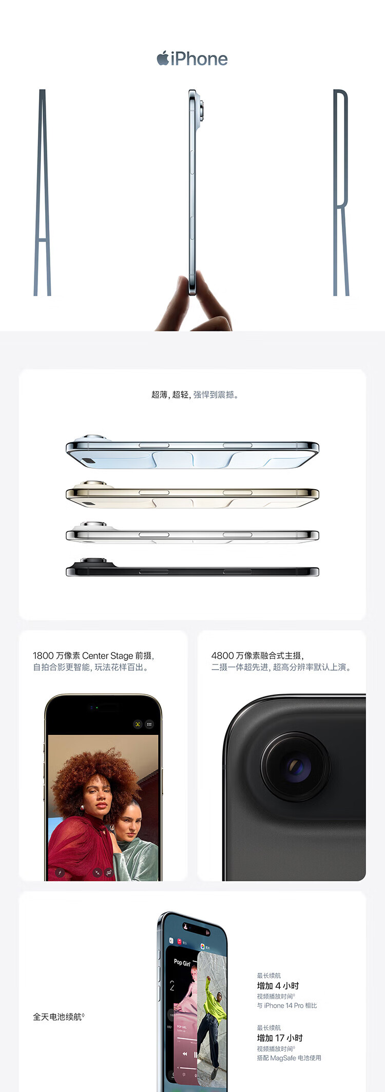 | 前置摄像头像素 | 1800 万像素 Center Stage 前置摄像头 |