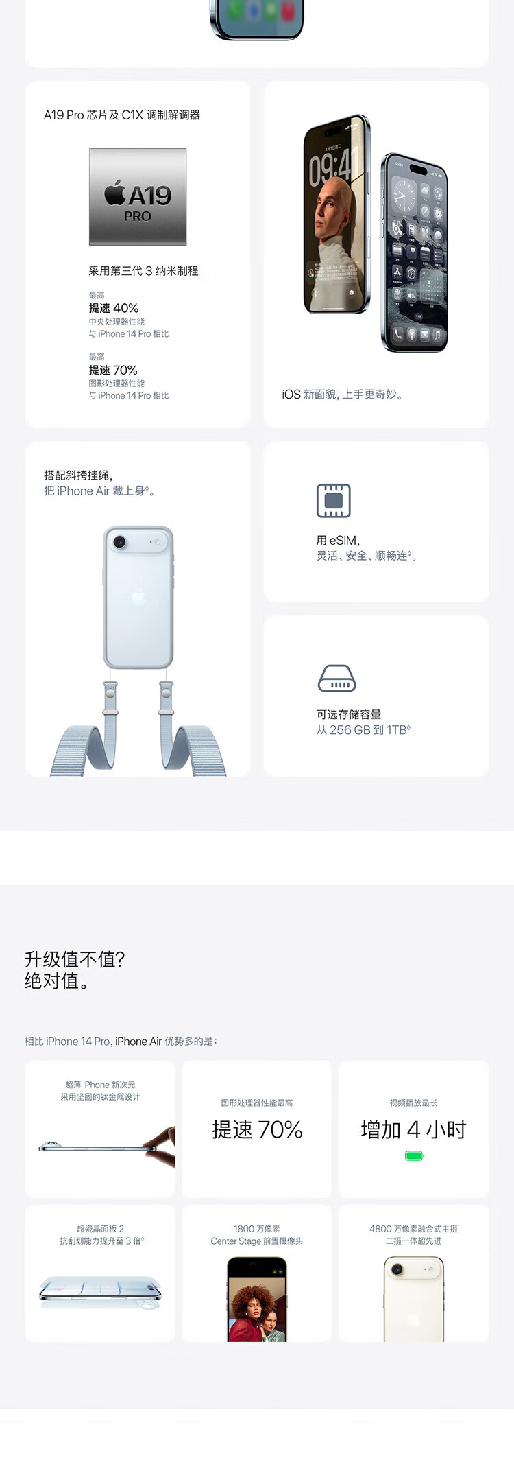 | 功能特征 | A19Pro第三代3纳米芯片,120Hz ProMotion自适应刷新率,薄至5.6毫米是迄今最薄的iPhone |