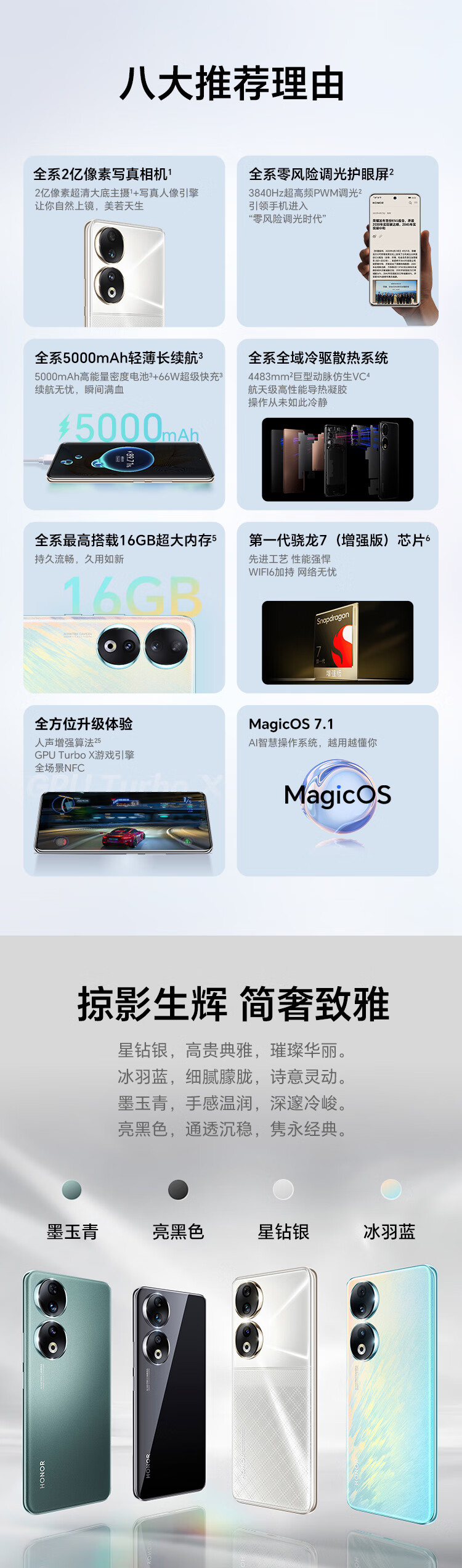 | 配置 | HONOR SuperCharge 充电器 x 1,USB Type-C 数据线 x 1,防尘薄膜(出厂已贴在手机上)×1,超薄保护软壳 x 1,取卡针 x 1 |