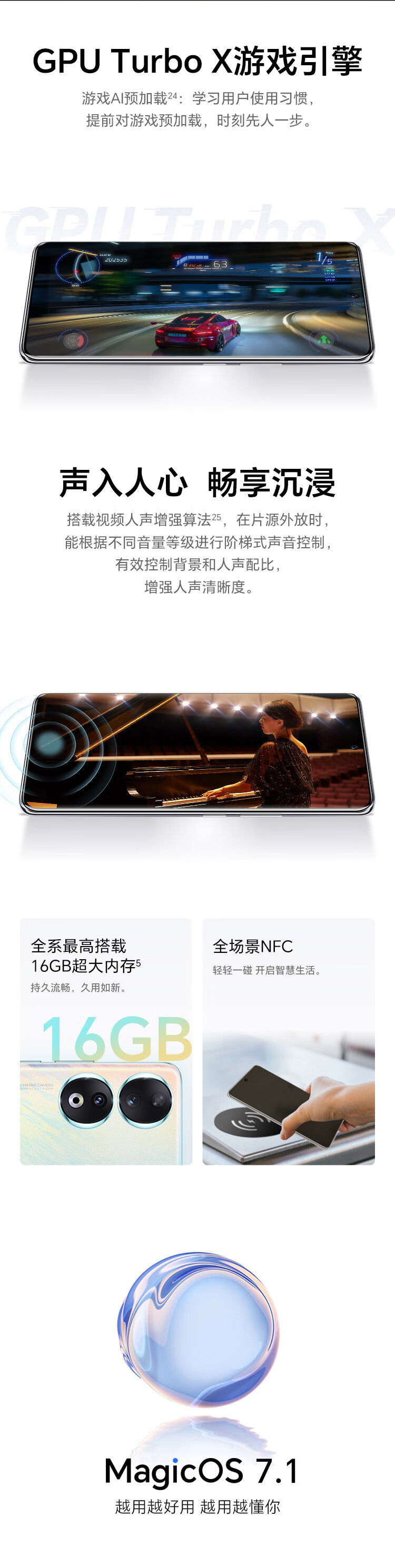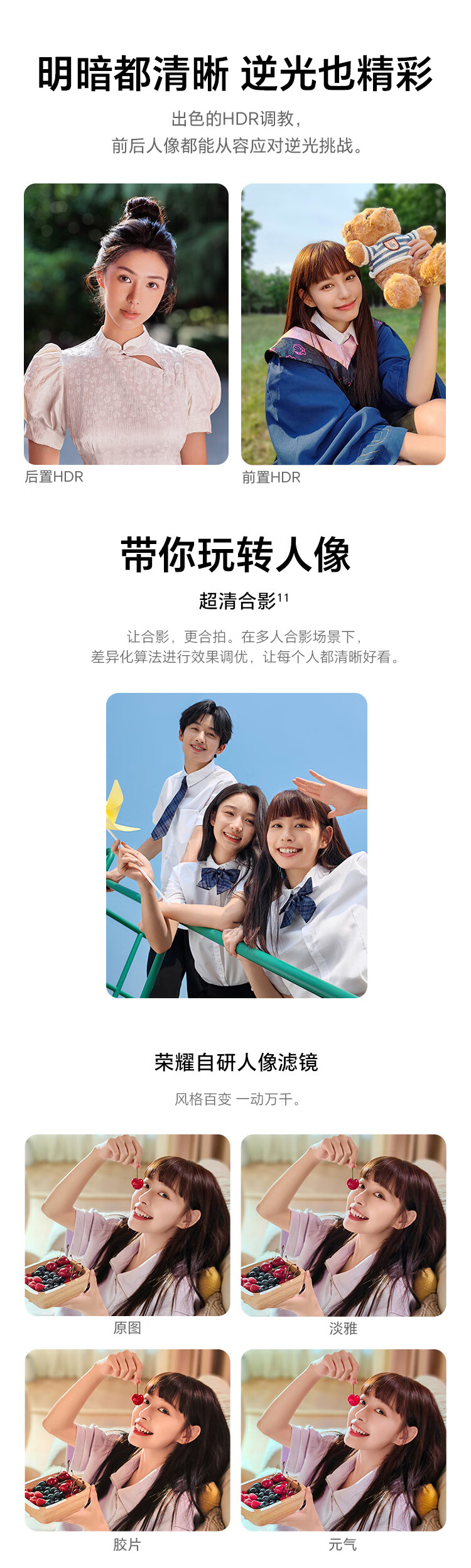 | 拍摄特色 | 前置:动态照片、人像模式、延时摄影、夜景模式、滤镜、笑脸抓拍、自拍镜像、声控拍照、定时拍摄、手势拍照、水印模式、高像素模式等; 后置:动态照片、延时摄影、AI摄影、AI视频、超大广角、大光圈、多镜录像、夜景模式、人像模式、专业拍照、录像、慢动作、全景模式、HDR拍照、HDR录像、滤镜、水印、文档扫描、超级微距、笑脸抓拍、声控拍照、定时拍摄、连拍、高像素模式、主角模式、微电影等 |