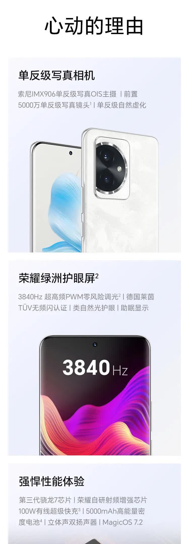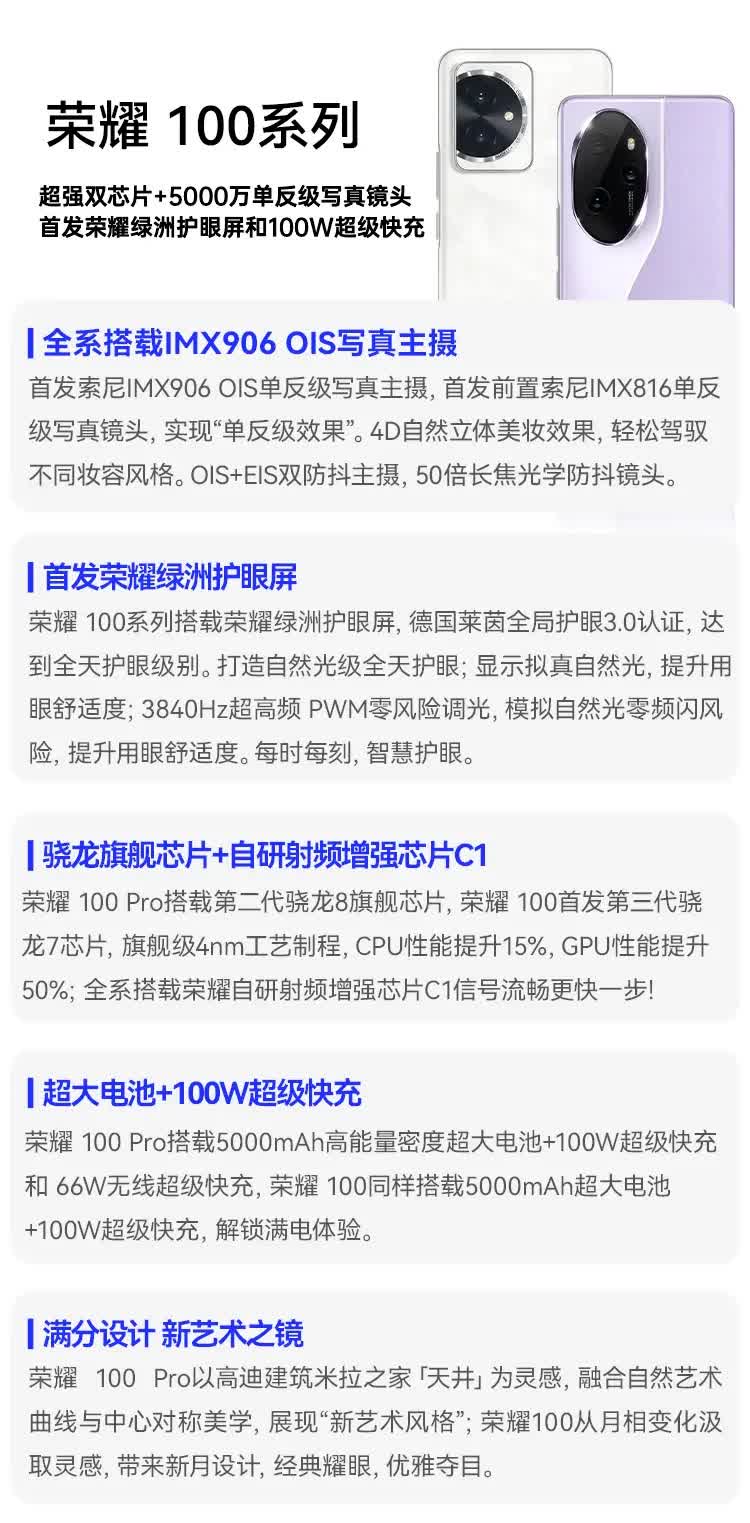 | 功能特征 | 单反级写真相机,荣耀绿洲护眼屏,100W有线超级快充 |