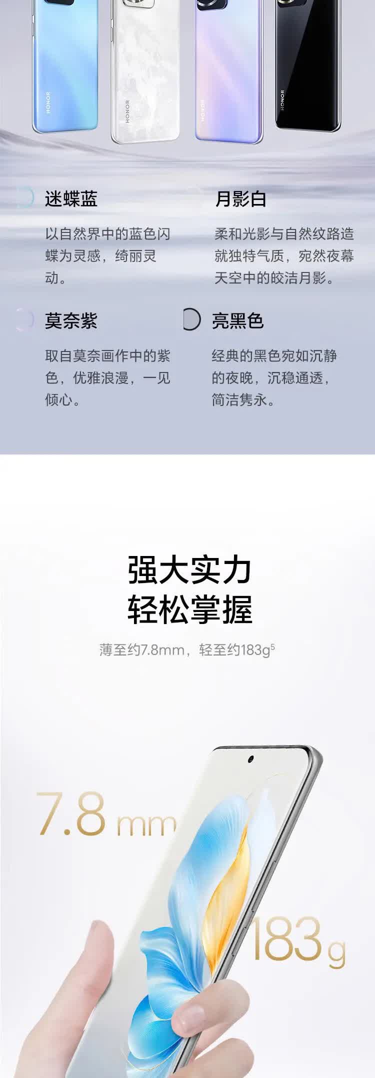 | 配置 | HONOR SuperCharge充电器×1,USB Type-C 数据线×1,超薄透明软壳×1,防尘薄膜 (出厂贴在设备上)×1,取卡针×1 |