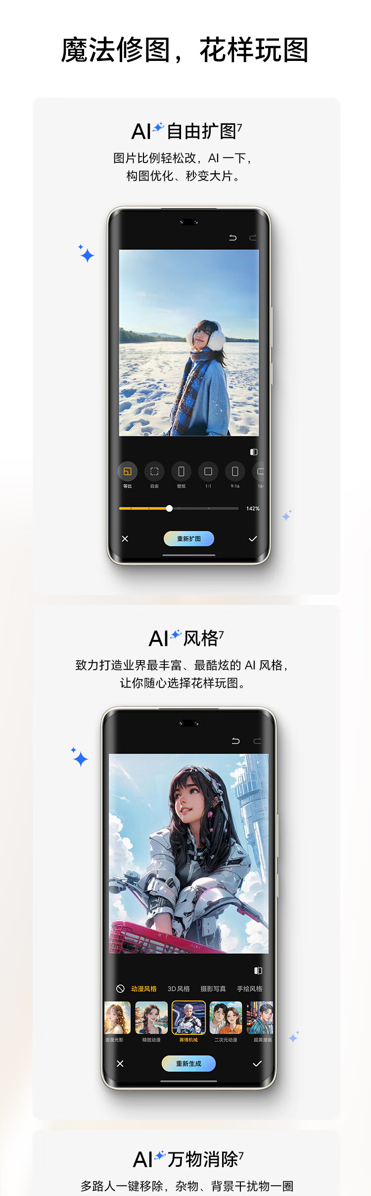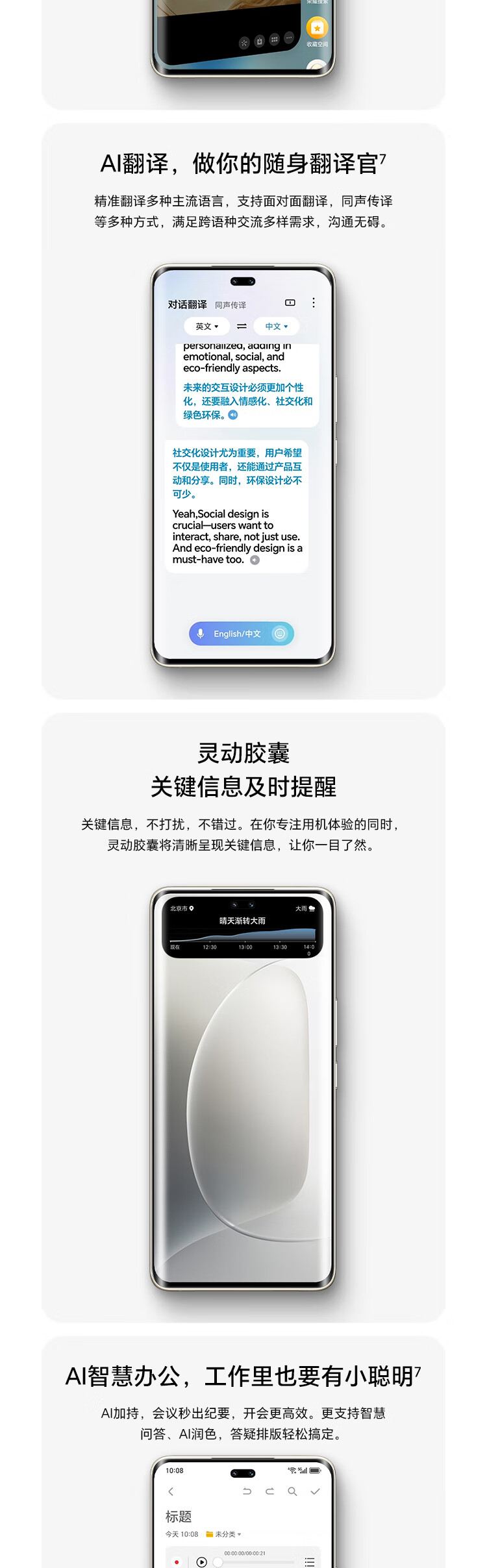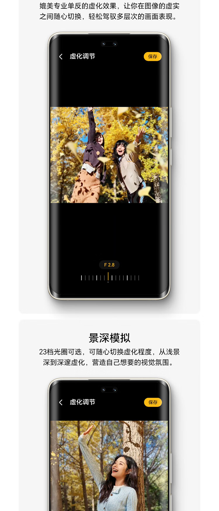 | 拍摄特色 | 雅顾人像艺术风格、鹰眼精彩抓拍、AI超清人像、动态照片、延时摄影、AI摄影、超大广角、大光圈、夜景模式、人像模式、专业拍照、录像、慢动作、全景模式、HDR拍照、夜景录像、智能广角、滤镜、水印、文档扫描、超级微距、笑脸抓拍、声控拍照、定时拍摄、连拍、长焦画中画、月亮模式、高像素模式 |