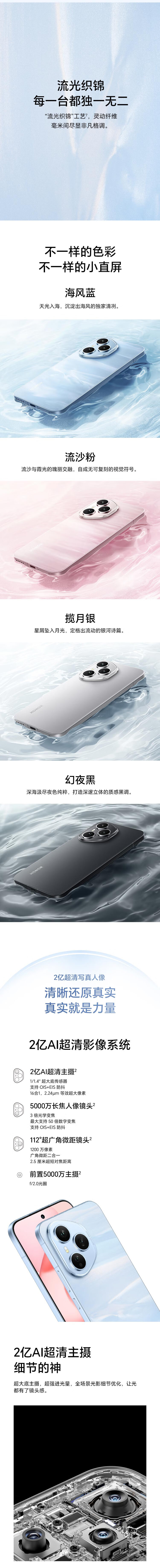 | 拍摄特色 | AI超级长焦、舞台模式、鹰眼精彩抓拍、鹰眼自动抓拍、雅顾人像艺术风格、胶片模拟、智能追焦、主角追焦、动态照片、延时摄影、AI摄影、广角、大光圈、多镜录像、夜景模式、人像模式(含美颜美妆)、专业模式、慢动作、全景、录像、HDR拍照、微电影、滤镜、水印、文档扫描、超级微距、笑脸抓拍、声控拍照、定时拍摄、智能广角、长焦画中画、月亮模式、超级夜景视频、连拍、高像素模式等 |