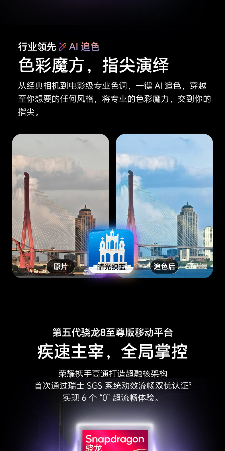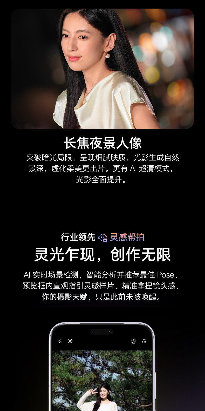 | 拍摄特色 | 后置拍摄模式:鹰眼超级连拍、AI超清雅顾人像、舞台模式、鹰眼精彩抓拍、鹰眼自动抓拍、智能追焦、主角追焦、多镜录像、AI摄影、 高像素模式、延时摄影、广角、夜景模式、超级微距、人像模式(含美肤)、 动态照片、HDR拍照、专业模式、慢动作、全景、滤镜、水印、笑脸抓拍、声控拍照、定时拍摄、文档扫描、一录多得、智能广角、连拍、长焦画中画、月亮模式、超级夜景视频、AI超清夜景、AI追色、灵感帮拍; 前置拍摄模式:人像模式、滤镜、笑脸抓拍、自拍镜像、声控拍照、定时拍摄、手势拍照、夜景模式、自拍环形补光、高像素模式、多镜录像; |