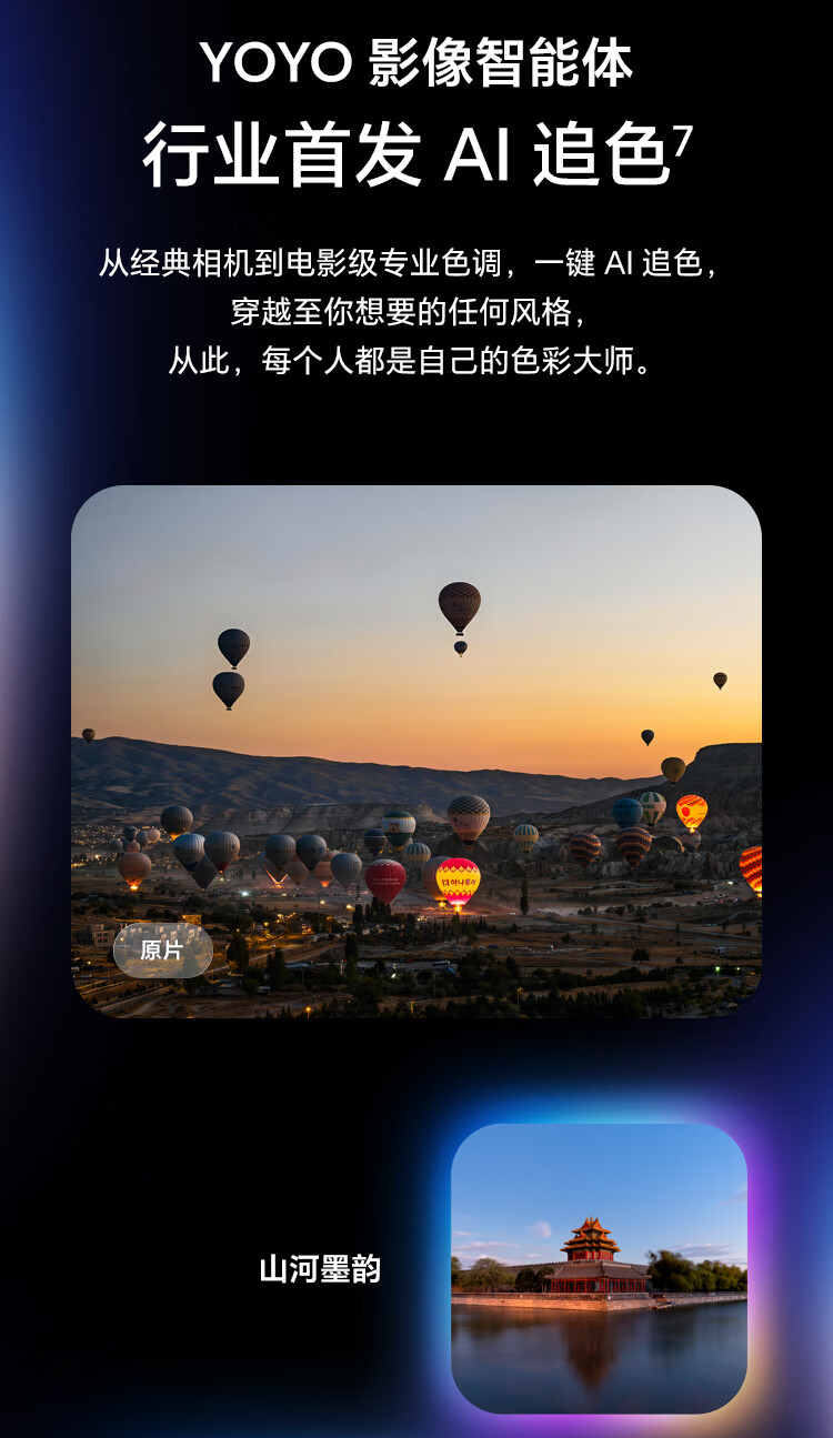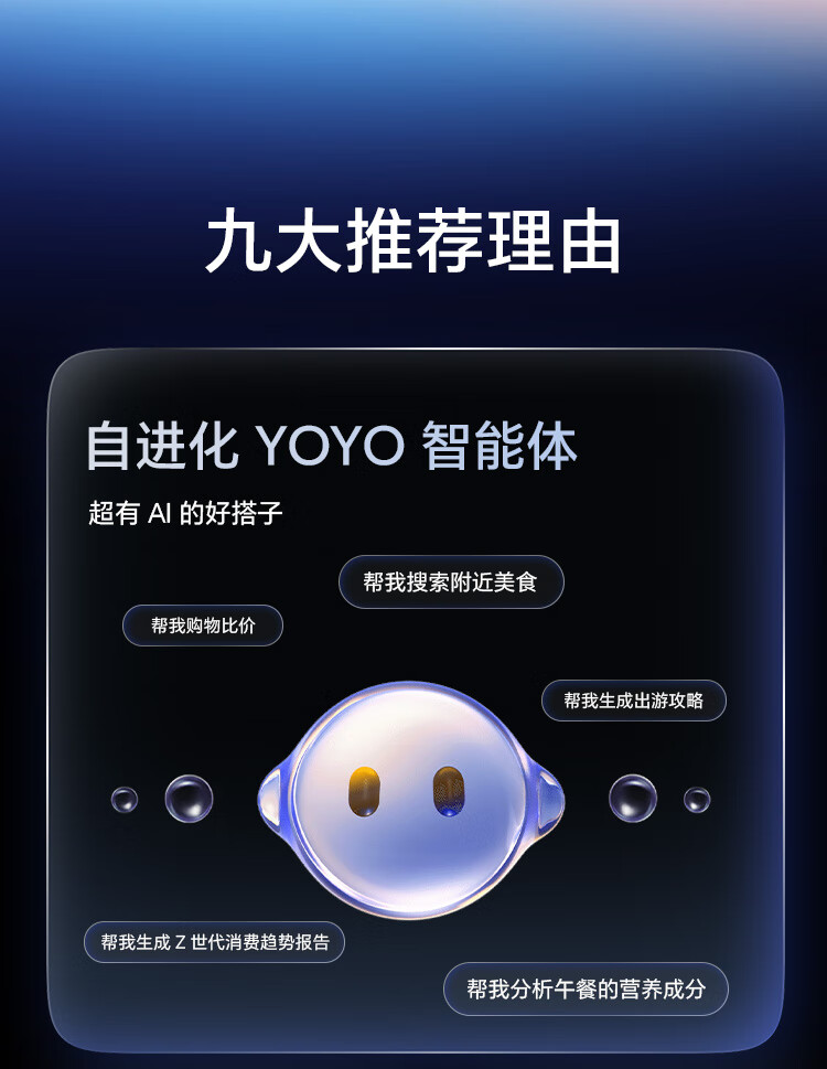 | 功能特征 | 全新自进化YOYO智能体,5000万超夜神主摄,2亿超夜神长焦,双3D解锁技术,三位一体AI反诈; |
