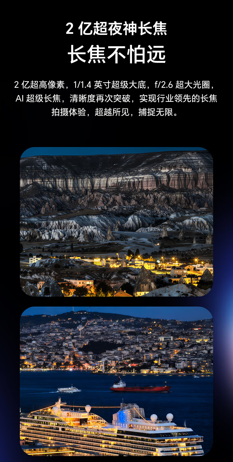 | 变焦模式 | 2亿超夜神长焦:1/1.4英寸超大底感光元件、ƒ/2.6 光圈、100% Focus Pixels、支持OIS光学防抖、3.7x光学变焦、最高可达100倍数字变焦; |