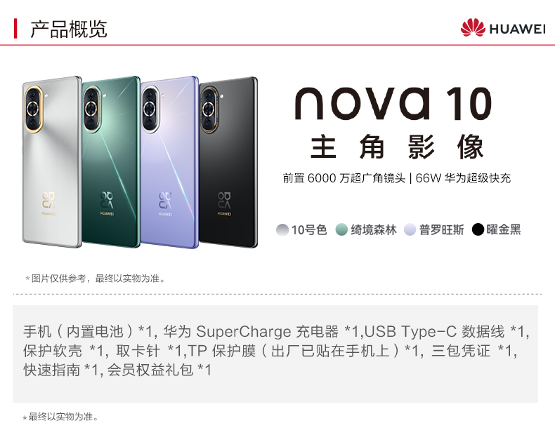 | 配置 | 华为 SuperCharge 充电器×1,USB Type-C数据线×1,保护软壳×1,取卡针×1,TP 保护膜(出厂已贴在手机上)×1 |
