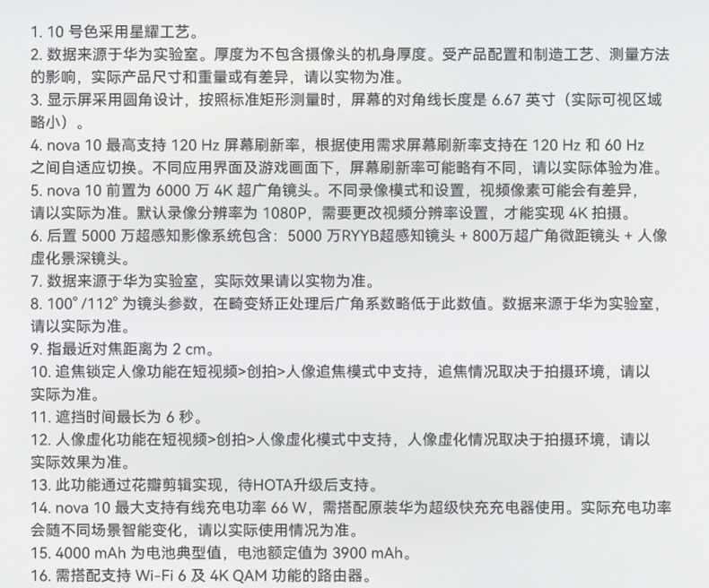 | 功能特征 | 前置6000万4K超广角镜头,66W华为超级快充,6.88mm轻薄机身 |