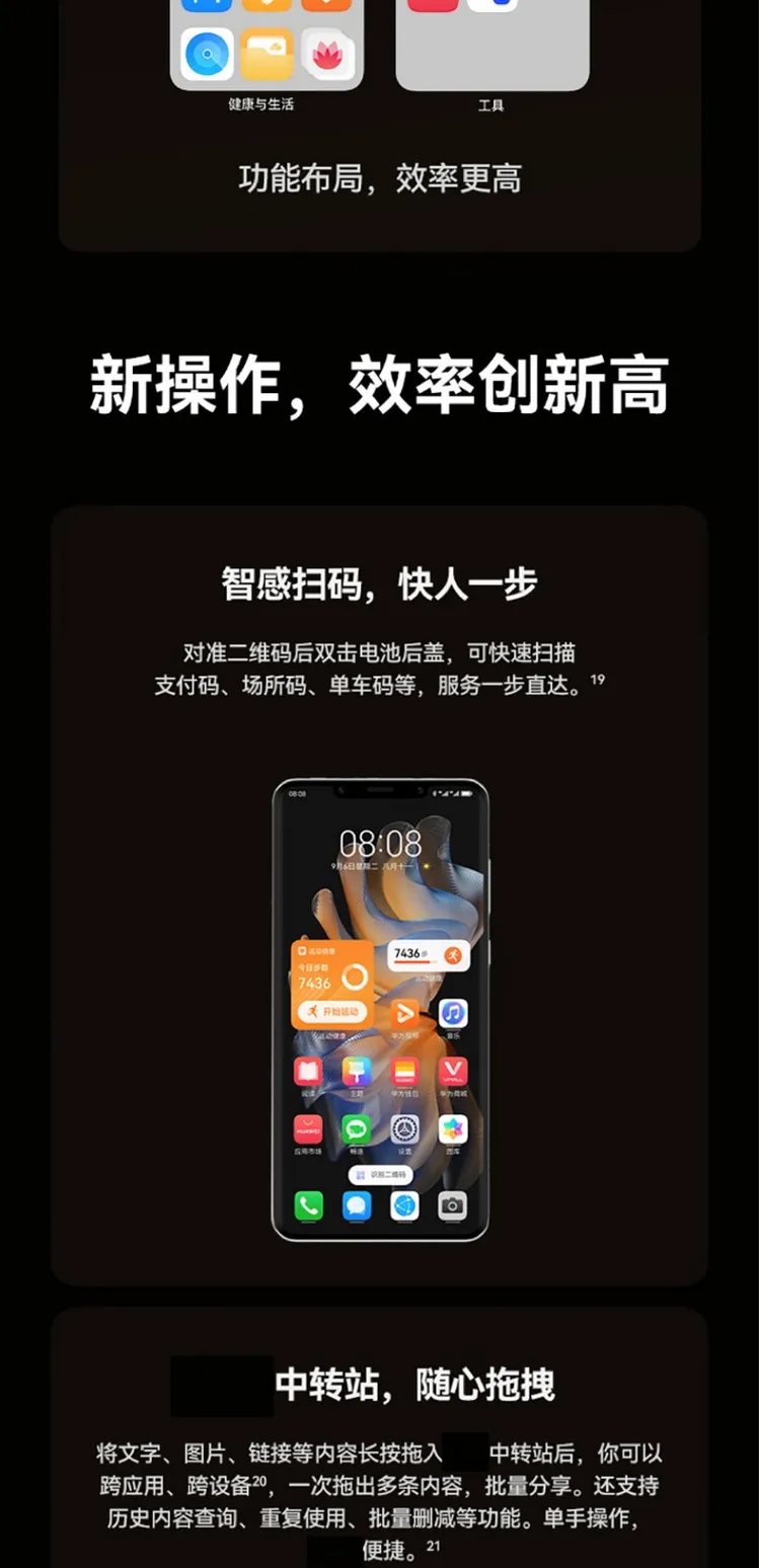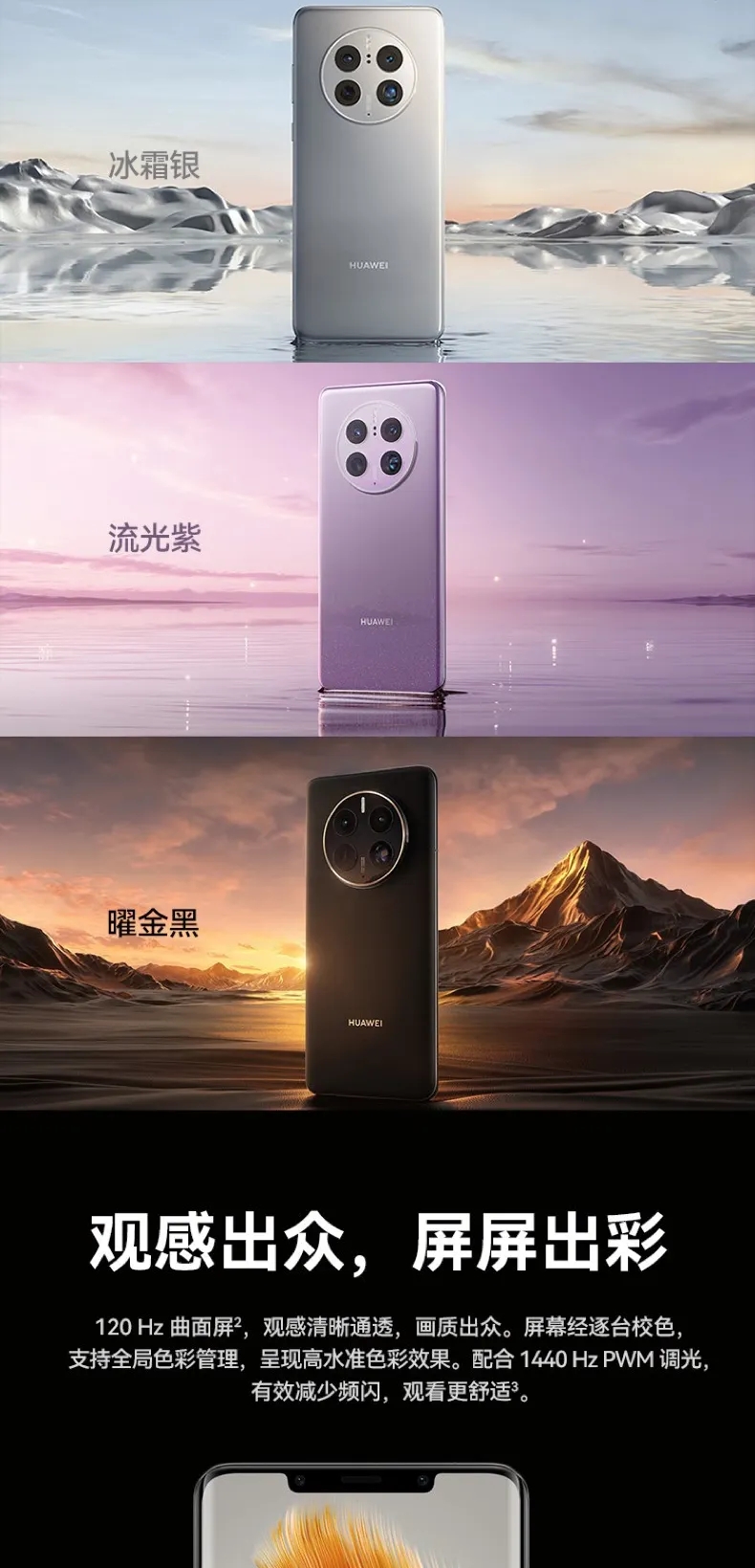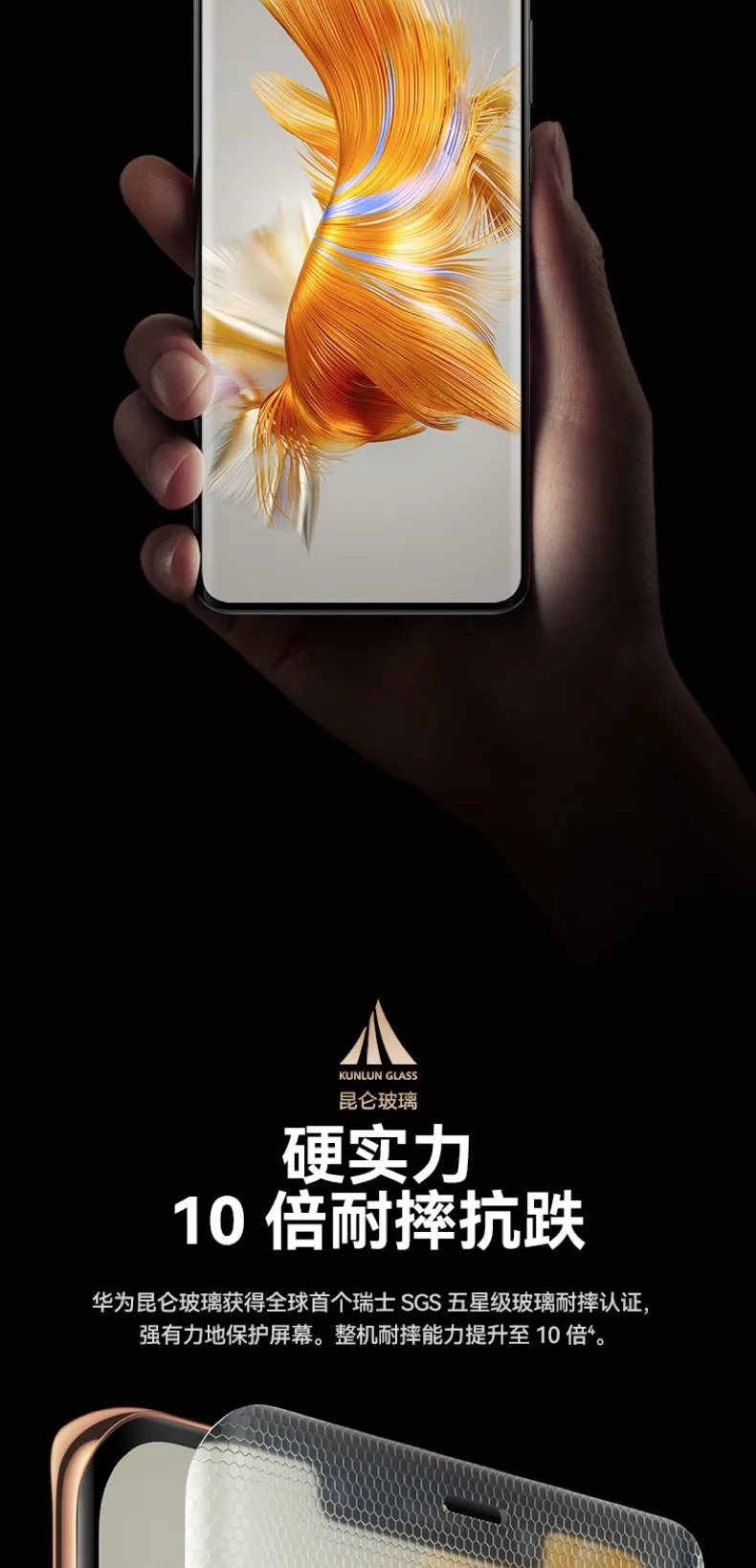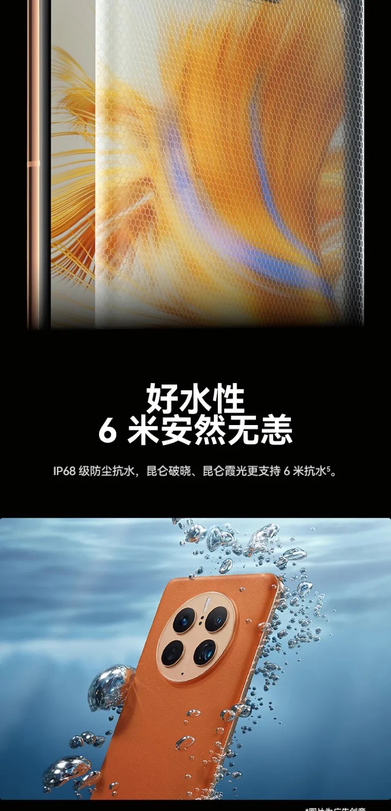 | 功能特征 | 120Hz曲面屏,IP68防尘防水,北斗卫星消息 |