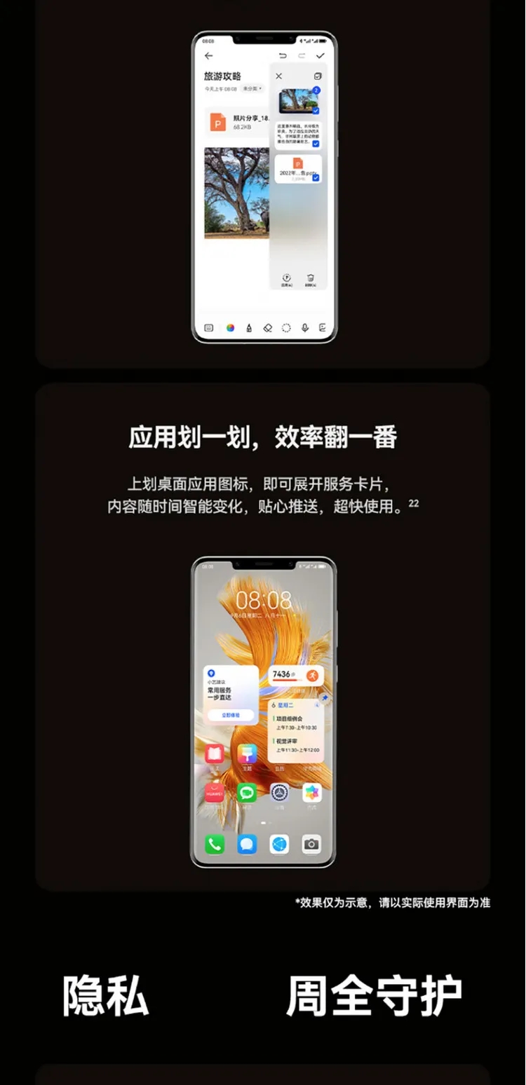 | 拍摄特色 | 后置摄像头: 智能可变光圈、物理光圈10档可调、超级夜景、超级微距、微距视频、视频HDR vivid、微距画中画、长焦画中画、微电影、音频变焦、高像素模式、延时摄影、超大广角、大光圈虚化、双景录像、超级夜景、人像模式、专业模式、慢动作、全景模式、黑白艺术、流光快门、智能滤镜、多机位、水印、文档矫正、AI摄影大师、动态照片、快拍、4D预测追焦、笑脸抓拍、声控拍照、定时拍照、连拍 前置摄像头: 慢动作、智能广角切换、夜景模式、人像模式、全景模式、趣AR、延时摄影、动态照片、智能滤镜、水印、笑脸抓拍、自拍镜像、声控拍照、定时拍摄 |