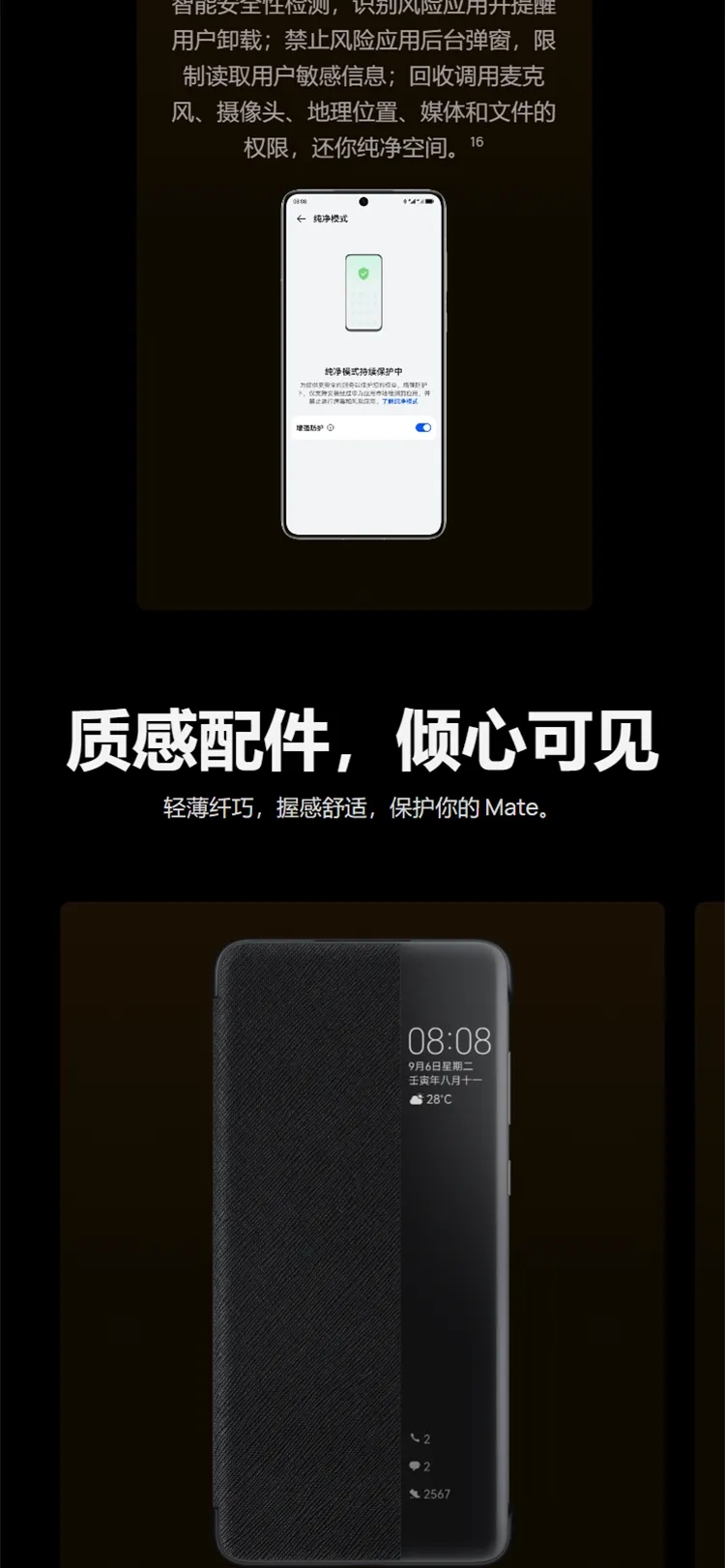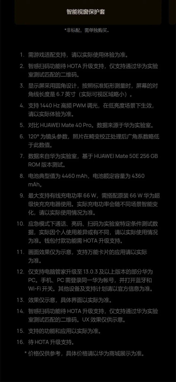 | 配置 | 华为 SuperCharge 充电器×1,USB Type-C 数据线×1,超薄保护软壳×1,快速指南×1,取卡针×1,保护膜(出厂贴在手机上)×1,三包凭证×1,会员权益礼包×1 |