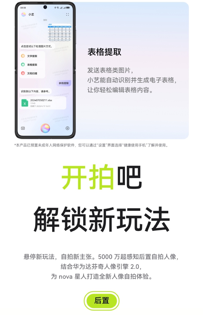 | 功能特征 | 6.88mm轻薄可靠,鸿蒙Al趣玩,后置5000万悬停自拍 |