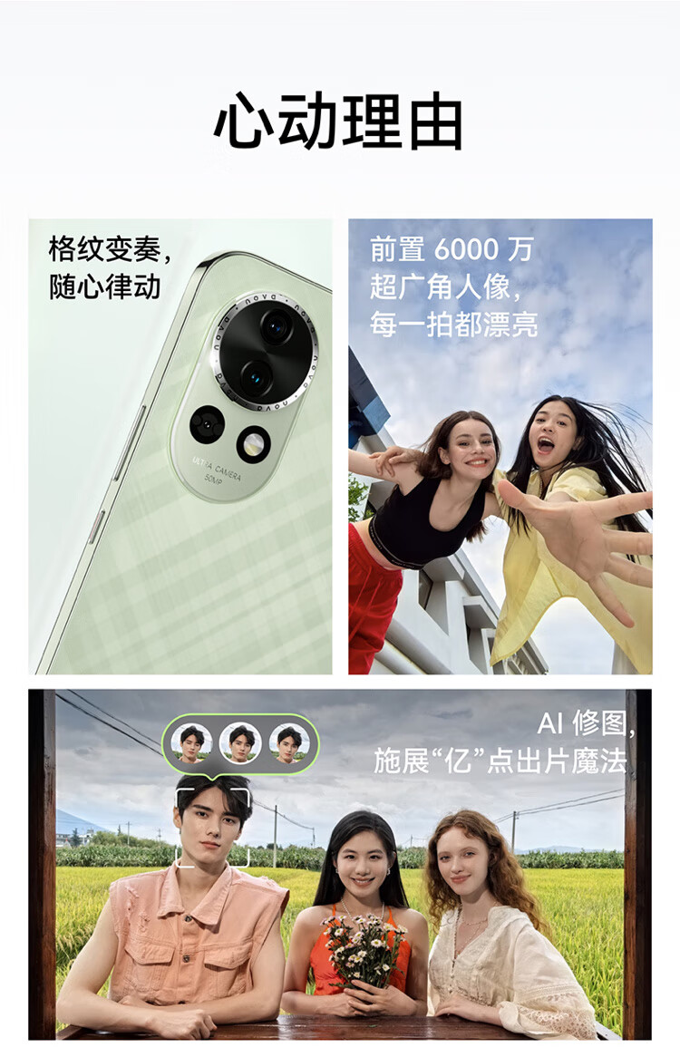 | 功能特征 | 前置6000万超广角人像,支持北斗卫星图片消息,轻薄直屏,大电池百瓦快充,支持AI扩图、消除、抠图 |