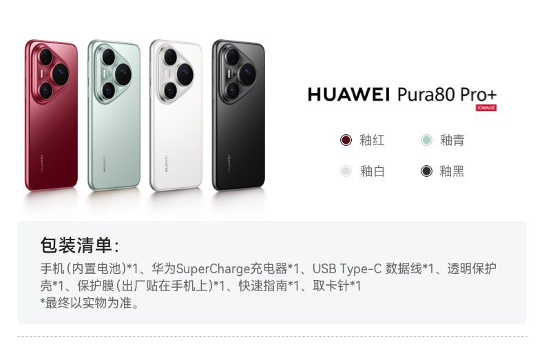 | 配置 | 华为SuperCharge充电器×1,USB Type-C 数据线×1,透明保护壳×1,防尘薄膜(出厂贴在手机上)×1,取卡针×1,快速指南×1 |