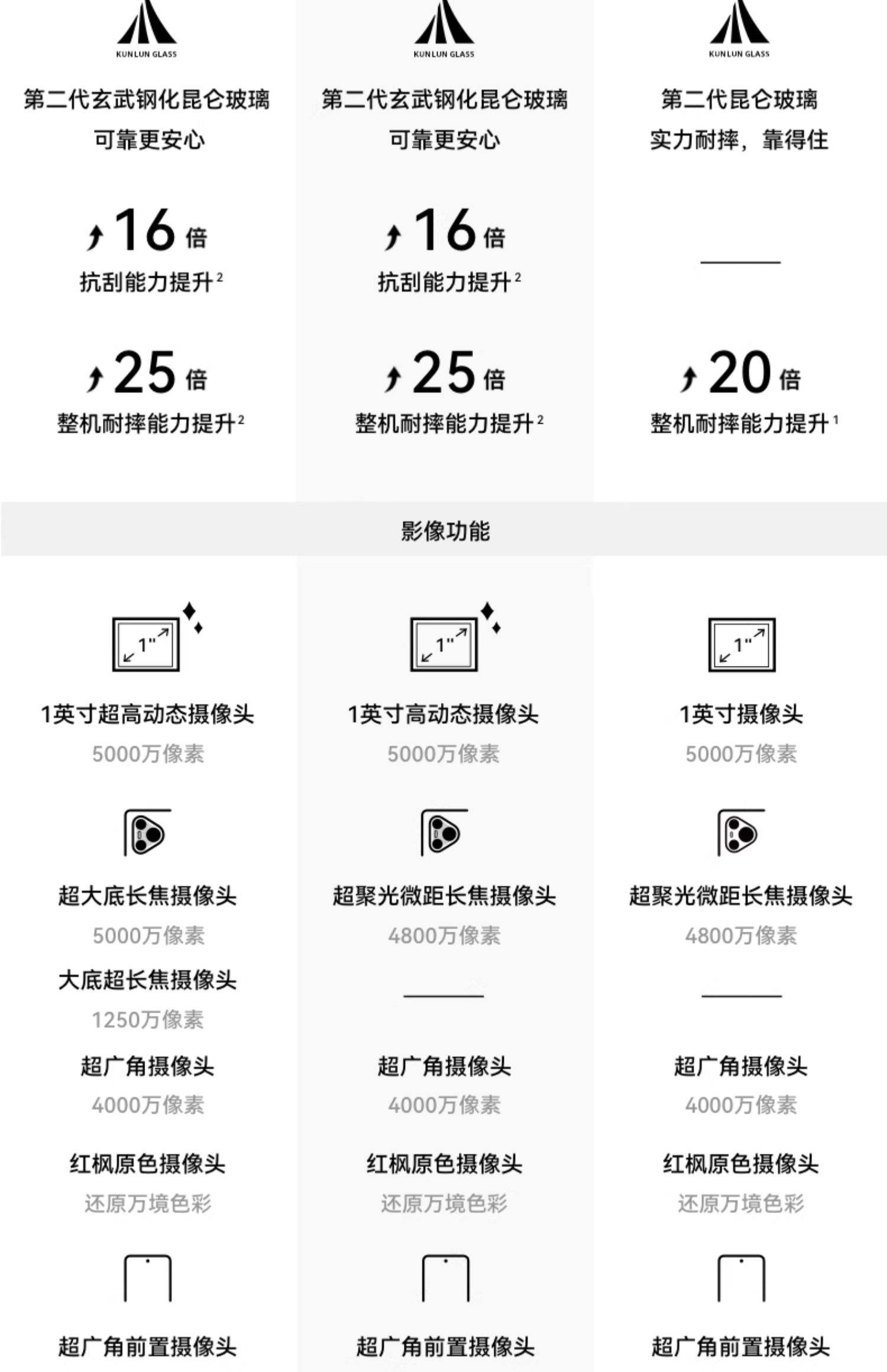 | 功能特征 | 一英寸高动态主摄,个性色卡 AI辅助构图,全新鸿蒙AI,第二代玄武钢化昆仑玻璃 |