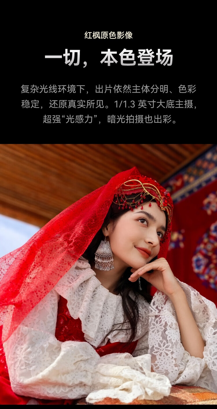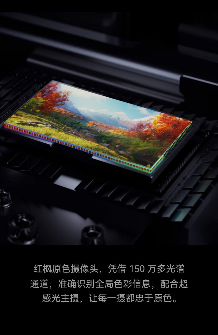 | 拍摄特色 | 后置摄像头:5000万像素1/1.3"超感光大底主摄(F1.8光圈,OIS光学防抖)+1200万像素RYYB长焦防抖镜头(F2.4 光圈,OIS 光学防抖)+800万像素超广角微距镜头(F2.2 光圈)+150万多光谱通道红枫原色摄像头; 前置摄像头:1070万像素超广角摄像头(F2.2 光圈) |