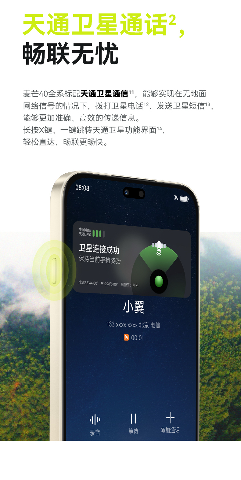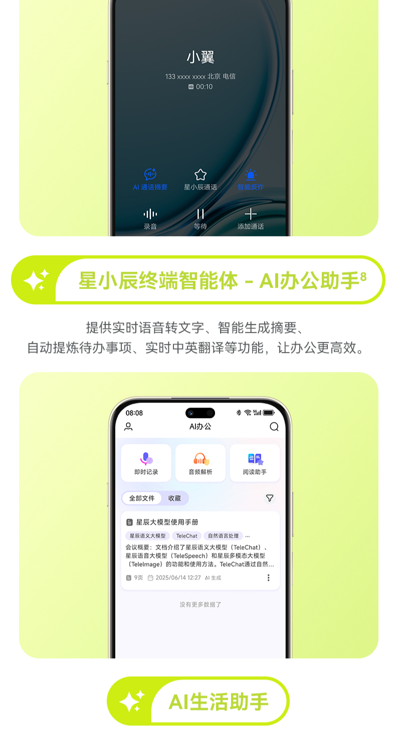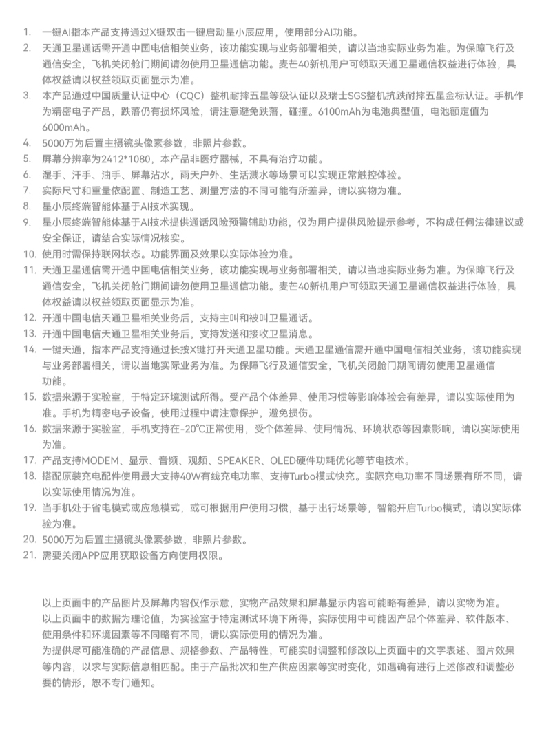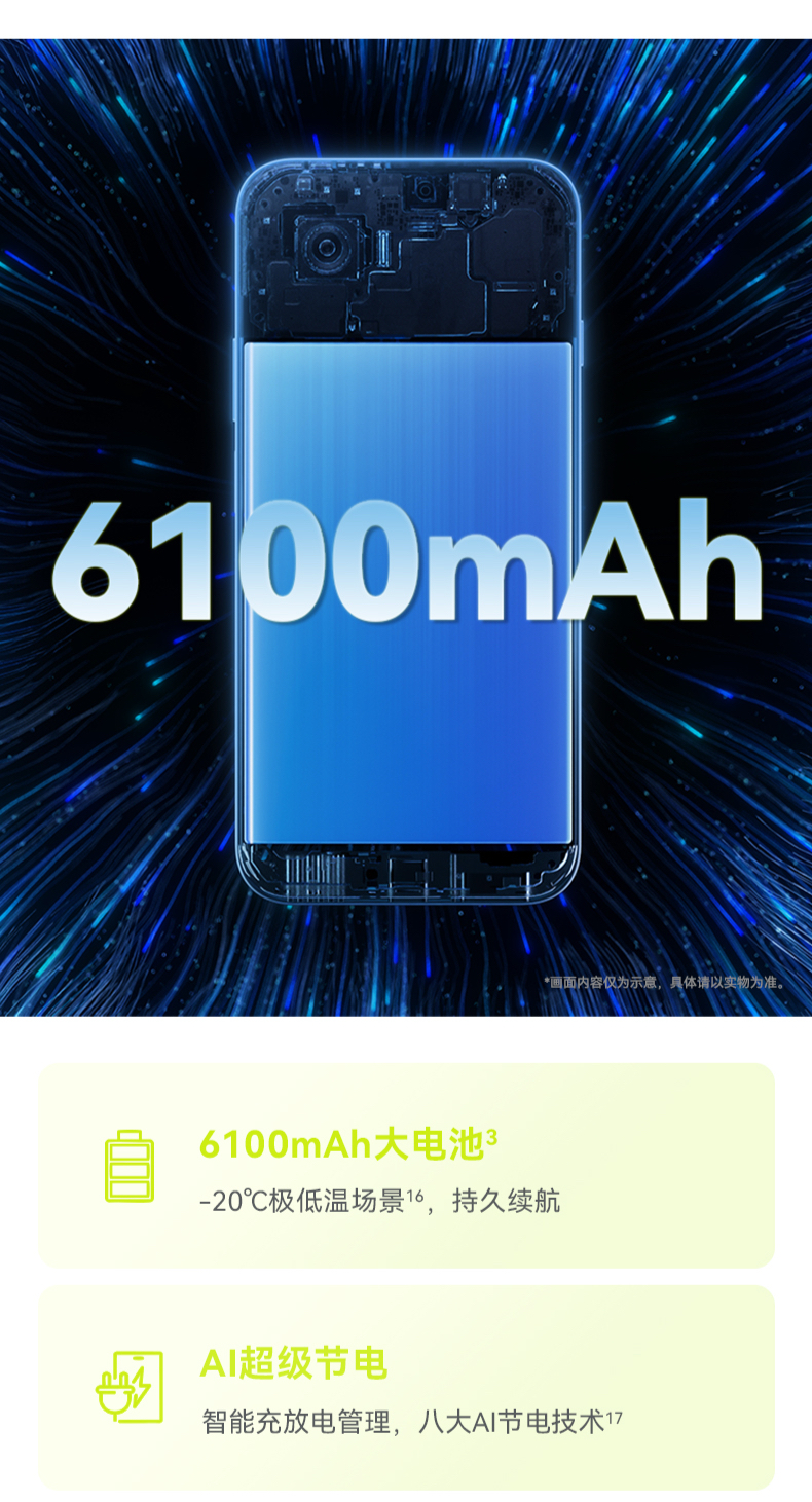 | 功能特征 | 6100mAh 长续航;内置AI大模型智慧直达;天通卫星通话畅联无 |