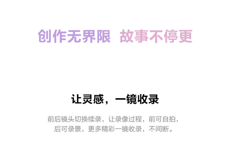 | 拍摄特色 | 短视频、微电影、音频变焦、多机位模式、AI美拍、超大广角、夜景模式、人像模式、高像素模式、拍照、专业拍照、录像、双景录像、超级微距、全景模式、延时摄影、慢动作、大光圈、水印、文档矫正、动态照片、智能滤镜、定时拍摄、笑脸抓拍、声控拍照、熄屏快拍、连拍 |