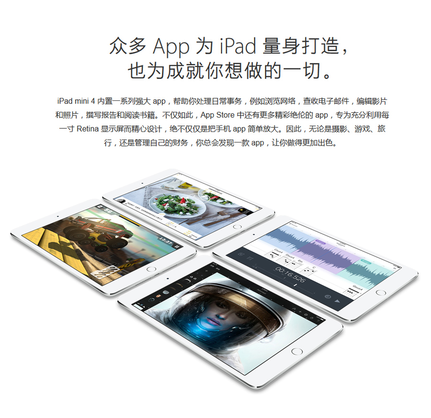 iPad mini 4 将你喜爱 iPad 的一切,全部浓缩在一个更为精致而便携的设计之中。现在,你尽可以与好友一起 FaceTime 视频通话,或是轻松搞定手边工作,随时随地,随你所愿