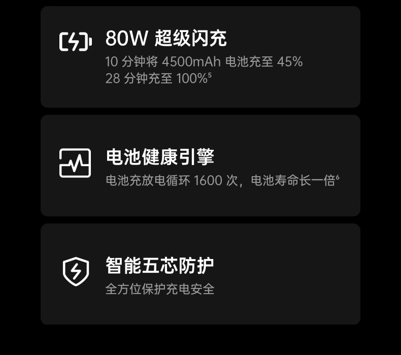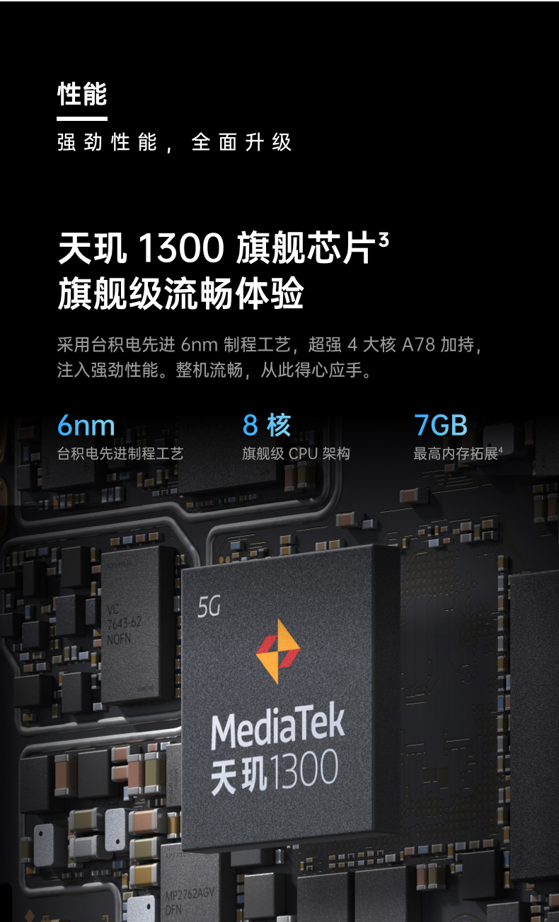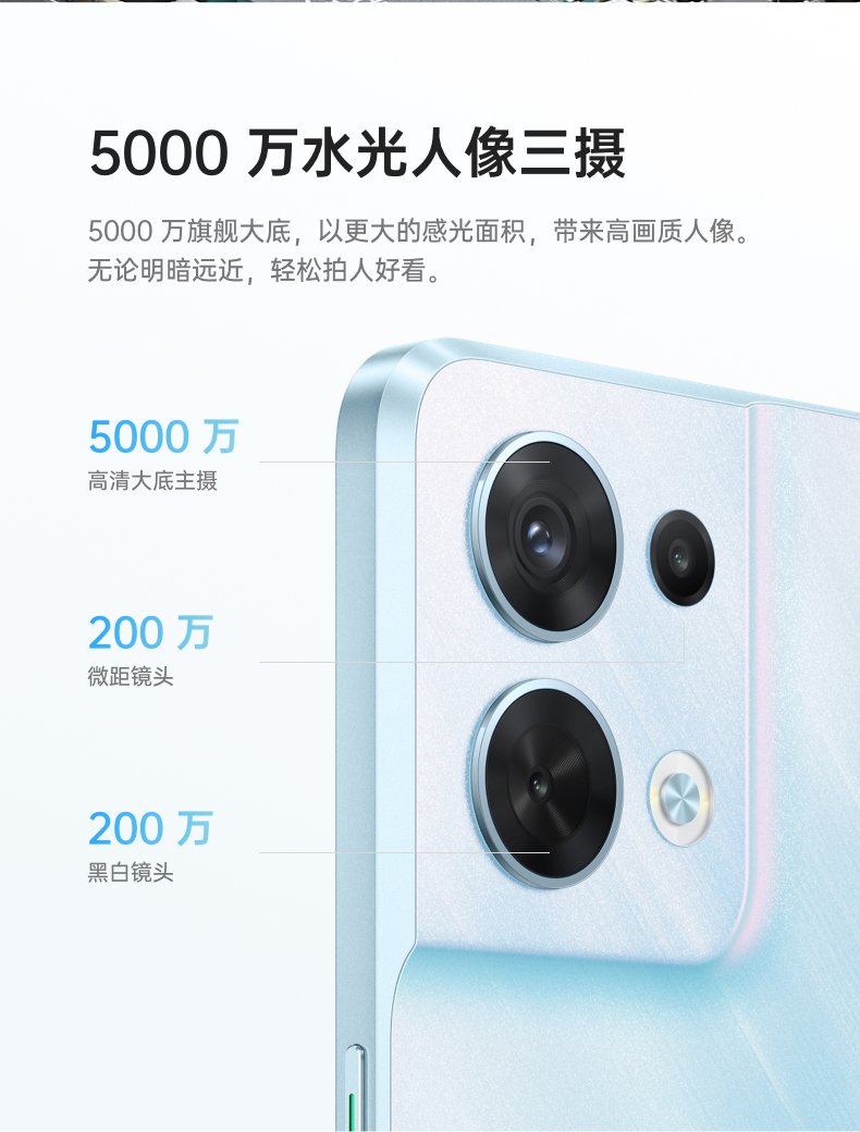 | 功能特征 | 5000万水光人像三摄,天玑1300,80W超级闪充 |