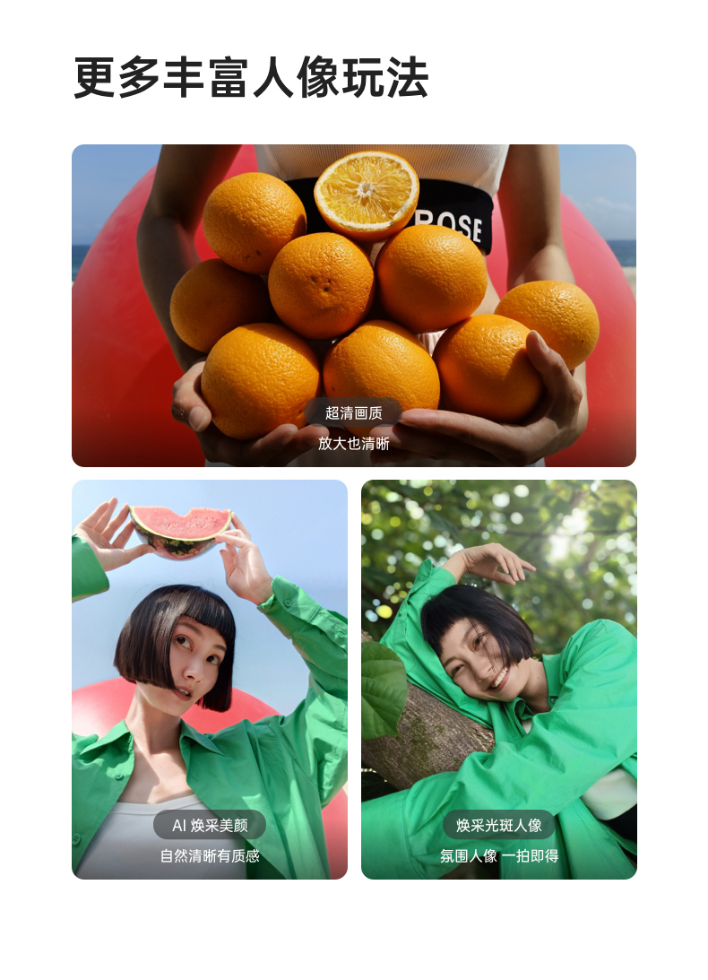 | 拍摄特色 | 后置拍摄模式:照片,人像,夜景,全景,专业,萌拍,超级文本,视频,电影,多景录像,微距,超清画质,AI证件照,延时摄影,慢动作,即录模板,扫一扫; 前置拍摄模式:照片,人像,夜景,全景,萌拍,视频,多景录像,AI证件照,延时摄影,即录模板。 |