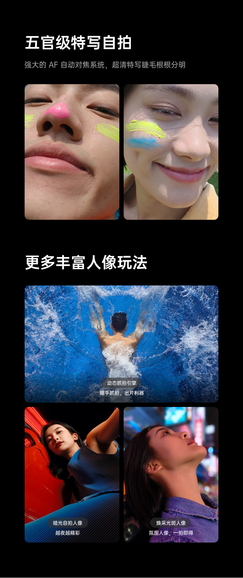 | 拍摄特色 | 后置拍摄模式:照片,人像,夜景,全景,专业,萌拍,超级文本,视频,电影,多景录像,微距,超清画质,AI证件照,延时摄影,慢动作,即录模板,扫一扫; 前置拍摄模式:照片,人像,夜景,全景,萌拍,视频,多景录像,AI证件照,延时摄影,即录模板 |