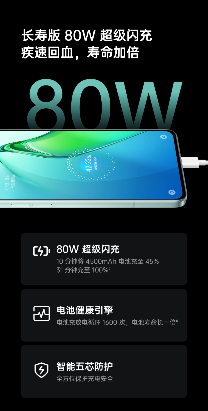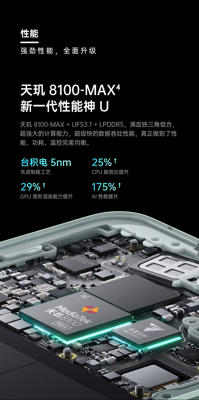 | 功能特征 | 天玑 8100-MAX,前后双旗舰人像镜头,长寿版 80W 超级闪充 |