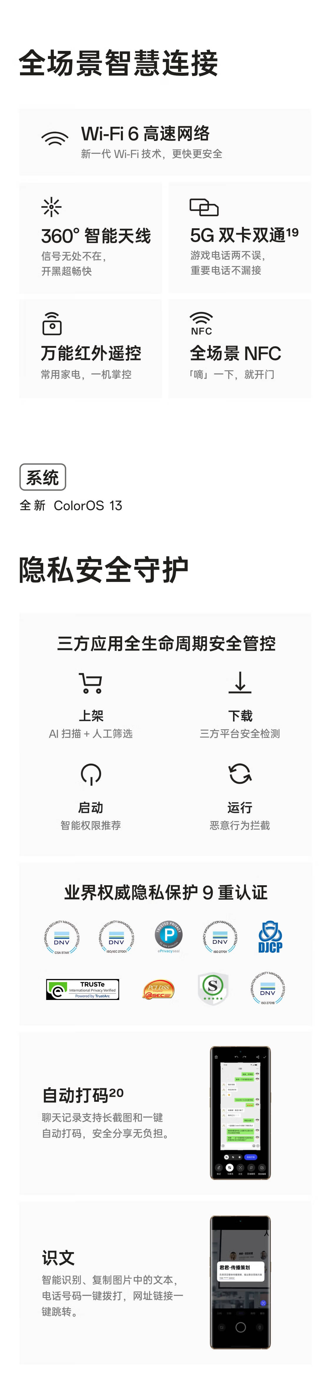 后置拍摄模式:夜景,视频,照片,人像,专业模式,超清画质,全景,微距,电影模式,慢动作,延时摄影,多景录像,萌拍,AI 证件照,超级文本,扫一扫 前置拍摄模式:照片,视频,全景,人像,夜景,延时摄影,多景录像,萌拍,AI 证件照
