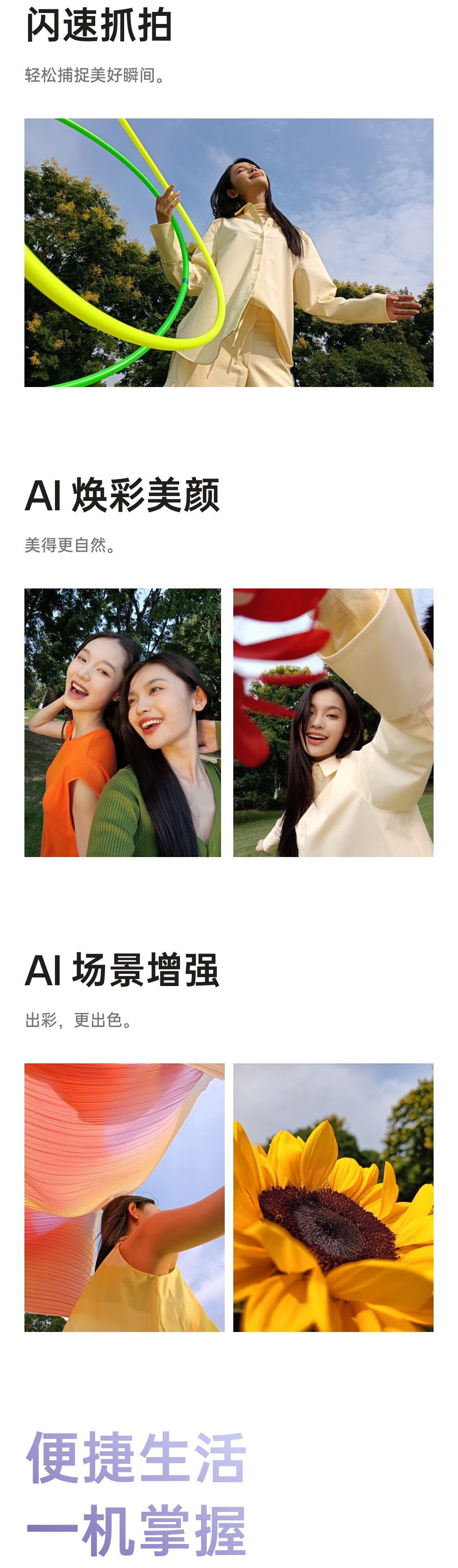 | 拍摄特色 | 后置:照片,视频,夜景,专业,全景,人像,延时摄影,慢动作,超级文本,超清画质,萌拍,AI 证件照; 前置:照片,视频,全景,人像,夜景,萌拍,AI 证件照,延时摄影,美颜自拍、屏幕补光等 |