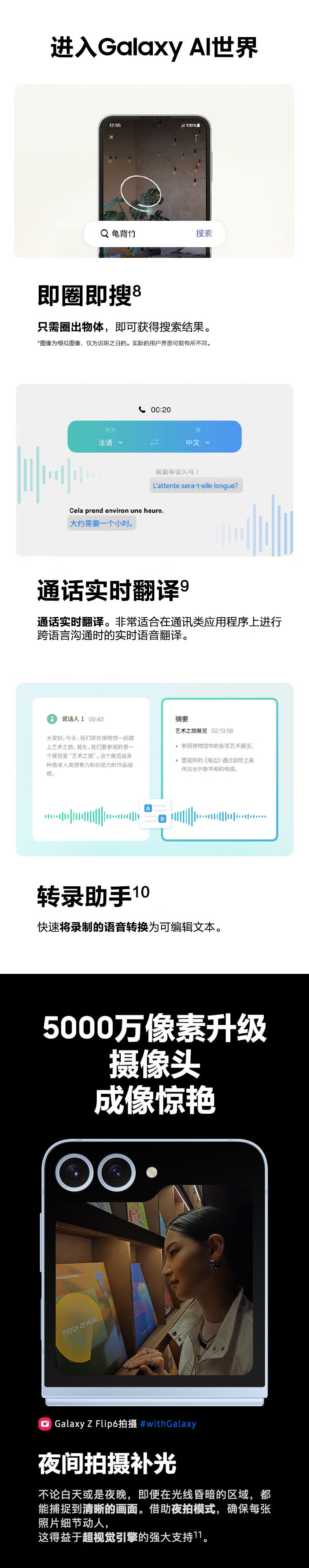| 功能特征 | 悬浮感设计纤薄精巧,5000万像素升级AI摄像头,支持AI现场翻译 通话翻译,23小时视频超强续航 |