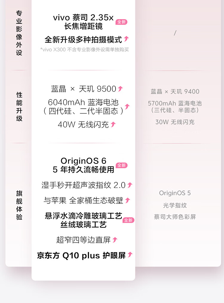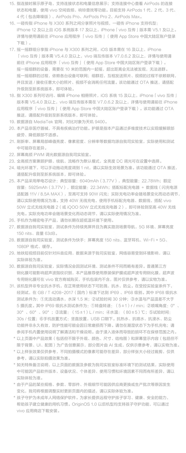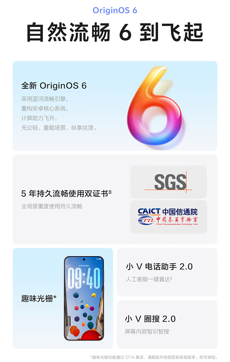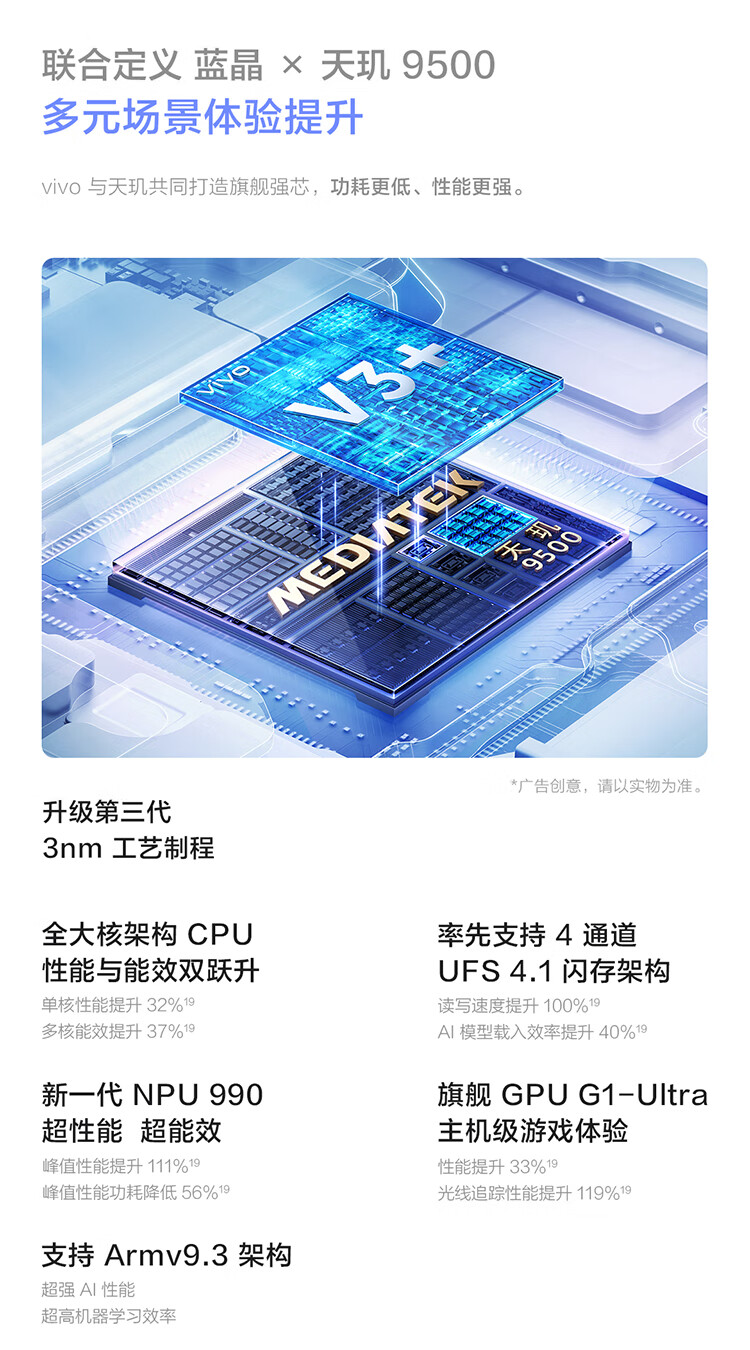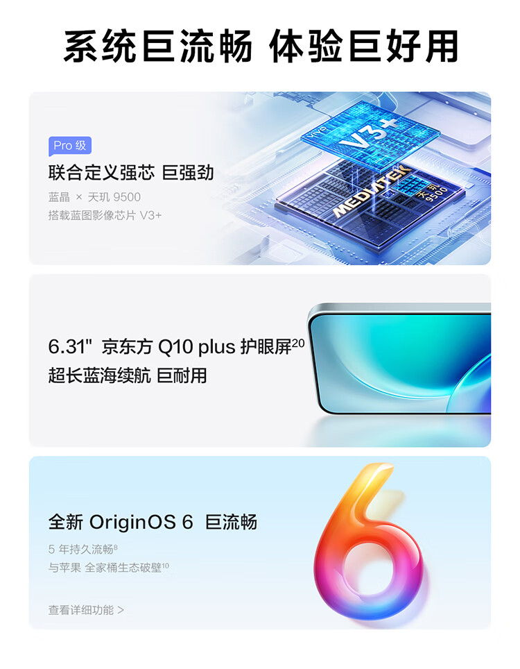 | 功能特征 | 蓝晶×天玑9500旗舰芯片,蔡司2亿超级主摄 巨出片,6040mAh蓝海大电池持久续航 |